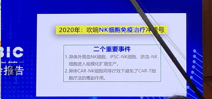 在2020中國生物技術創新大會上,中國科學技術大學教授、中國工程院院士田志剛在主題《合成免疫技術與腫瘤免疫治療》中表示,2020年吹響了NK細胞免疫治療的沖鋒號:異體外周血NK細胞、iPSC-NK 細胞、臍血-NK細胞進入規模化擴增生產;異體CAR-NK細胞同等療效下避免了CAR-T細胞療法的毒副作用。