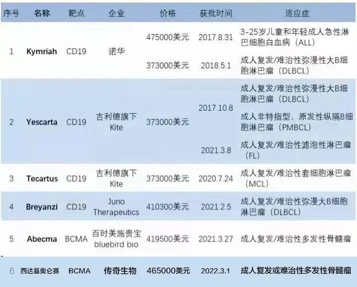 截止到2022年3月,FDA共批準了六款 CAR-T 療法,中國也上市了兩款CAR-T產品——阿基侖賽注射液、瑞基奧侖賽注射液,正式迎來細胞免疫治療元年。