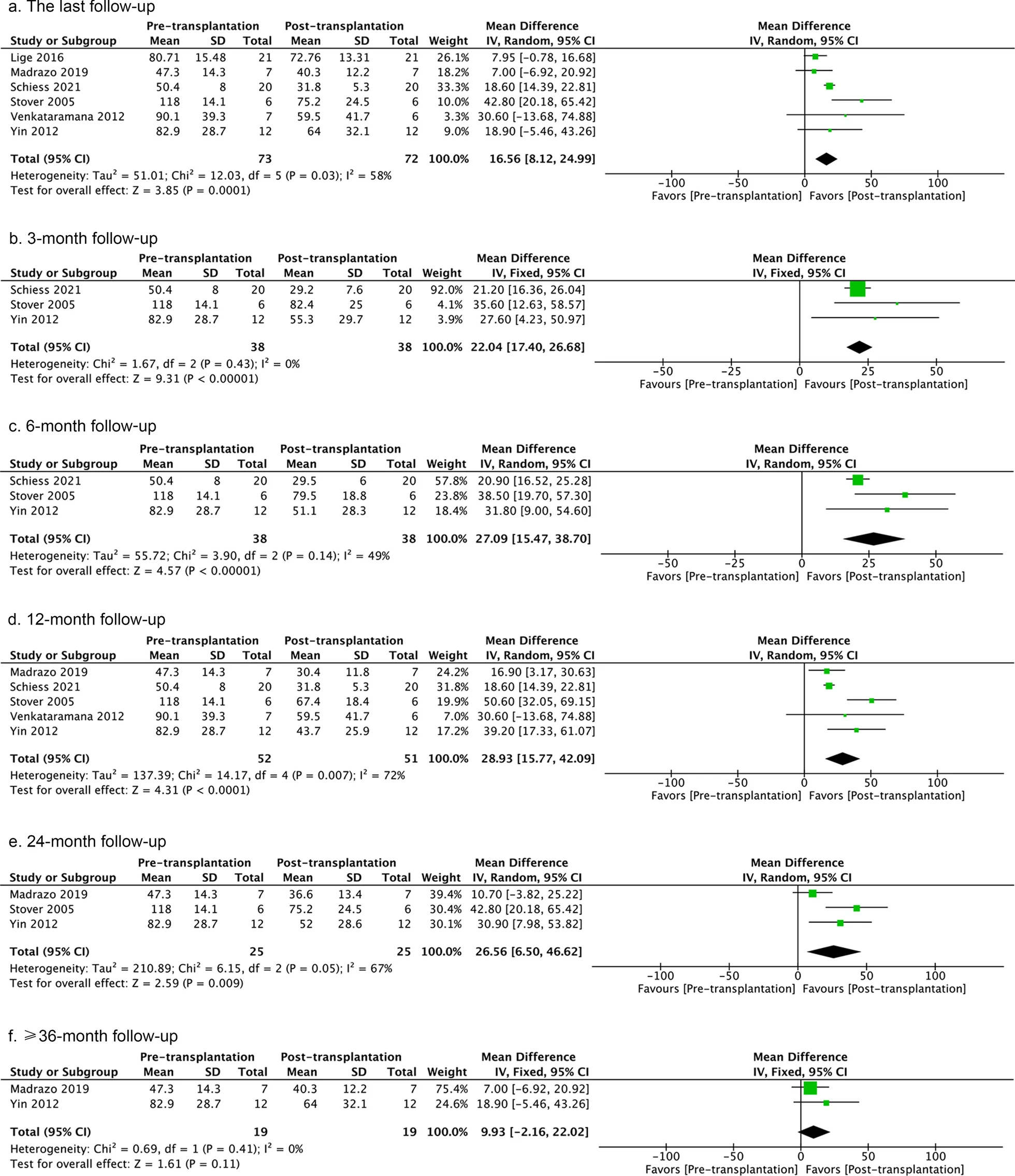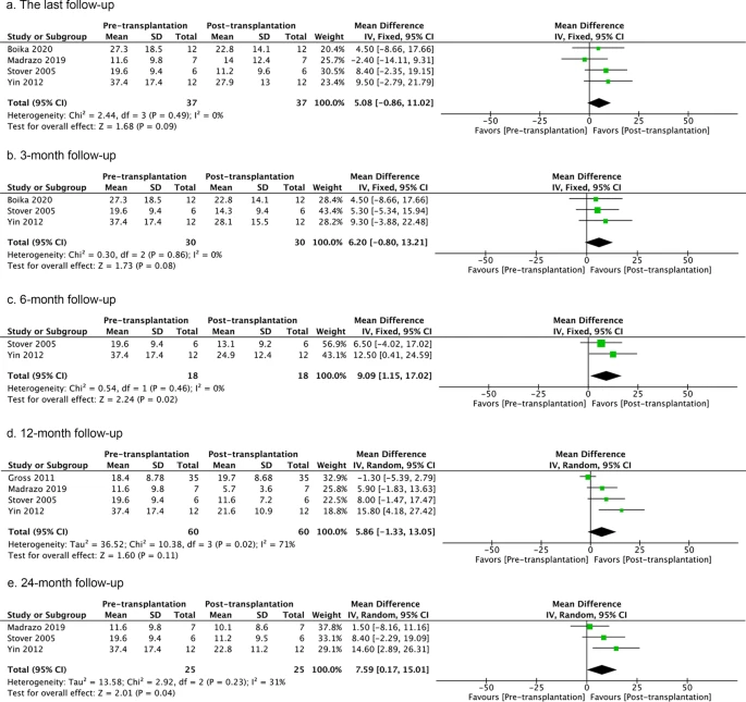 薈萃分析顯示,治療后與治療前相比,總體功能更好,但異質(zhì)性也很明顯。在最后一次隨訪以及3、6、12和24個(gè)月的隨訪中,同種細(xì)胞療法對 “關(guān)閉 “狀態(tài)下的UPDRS評分產(chǎn)生了有益的影響,但在≥36個(gè)月的隨訪中沒有這種影響(圖2)。然而,只有兩項(xiàng)研究報(bào)告了后者(圖2)。在3個(gè)月、6個(gè)月和≥36個(gè)月的隨訪分析中,”關(guān)閉 “狀態(tài)下的UPDRS評分顯示出相對的同質(zhì)性(圖2)。此外,細(xì)胞治療改善了12個(gè)月隨訪時(shí) “開啟 “狀態(tài)下的UPDRS評分,但沒有改善最后一次隨訪或24個(gè)月、≥36個(gè)月隨訪時(shí)的評分(附加文件2:圖S2)。在12個(gè)月、24個(gè)月、≥36個(gè)月的隨訪中沒有明顯的異質(zhì)性,但在最后一次隨訪中卻有明顯的異質(zhì)性。這可能是由于不同的移植范例造成的。