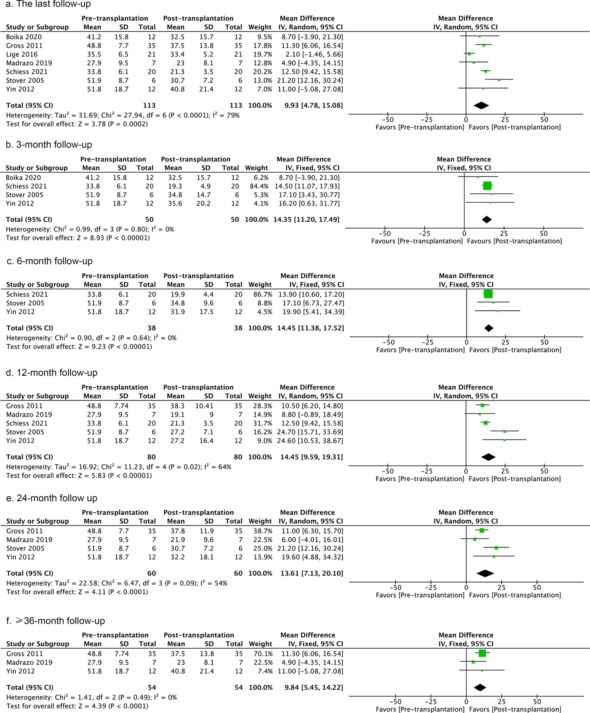 在3、6、12、24和≥36個(gè)月的隨訪中,對處于“關(guān)閉”狀態(tài)的細(xì)胞處理后的UPDRSIII評分進(jìn)行分析,結(jié)果顯示出積極的效果。分析“開啟”狀態(tài)下的UPDRSIII評分顯示,與基線狀態(tài)相比,干細(xì)胞治療在6個(gè)月和24個(gè)月的隨訪中具有有益效果,但在最后一次隨訪以及3個(gè)月或12個(gè)月的隨訪中都沒有效果(圖4)。最后一次隨訪以及3、6和24個(gè)月隨訪時(shí)研究間異質(zhì)性較低(圖4)。12個(gè)月的隨訪顯示出高度異質(zhì)性。