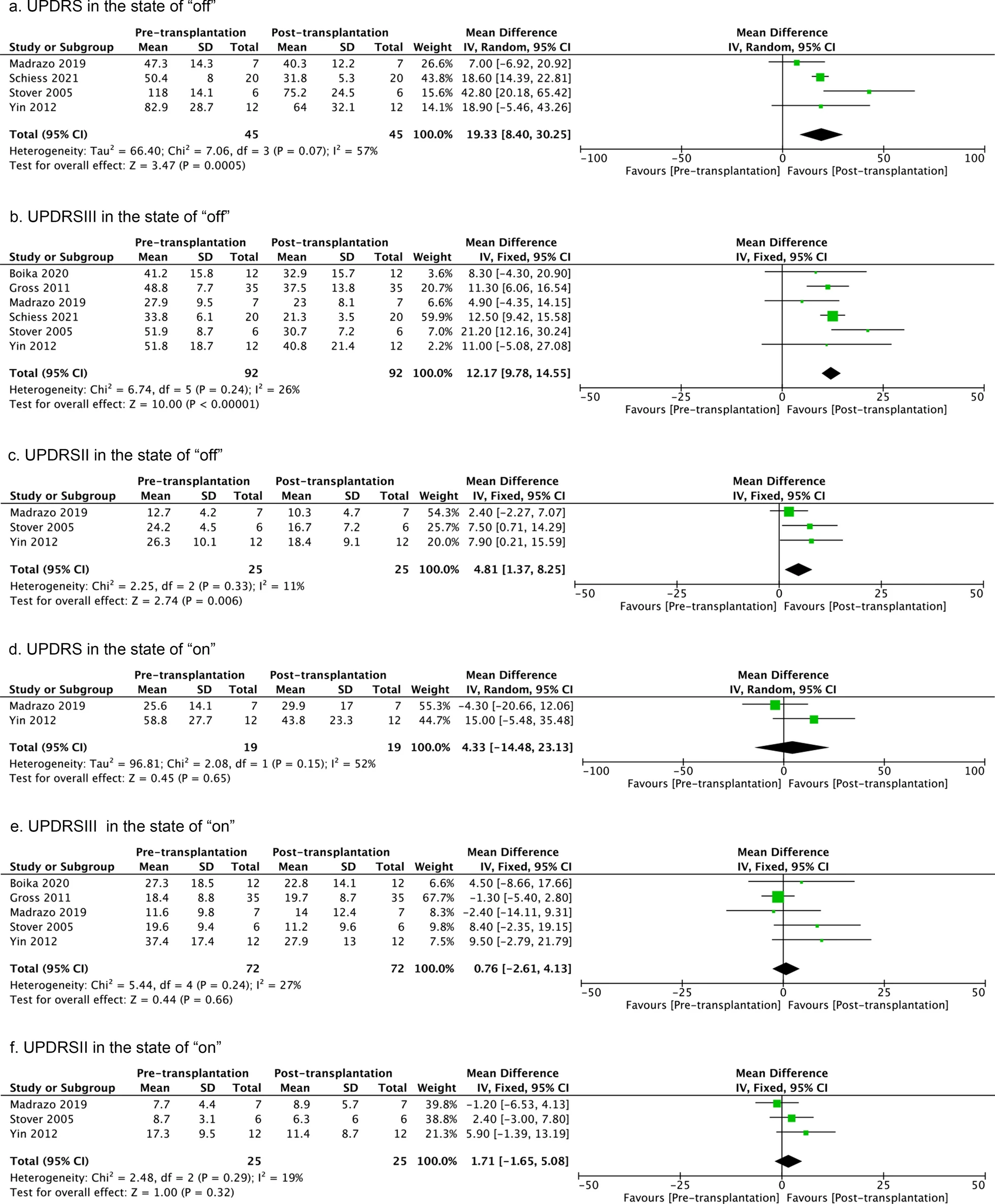 使用UPDRSII或Schwab和England評分評估ADL。四項(xiàng)研究檢查了最后一次隨訪時(shí)處于“關(guān)閉”狀態(tài)的UPDRSII評分。固定效應(yīng)模型顯示同質(zhì)細(xì)胞治療后有更好的結(jié)果。三項(xiàng)研究評估了“開啟”狀態(tài)下的 UPDRSII 評分(全部使用同種異體細(xì)胞),但沒有報(bào)告治療效果。沒有明顯的異質(zhì)性(圖5)。