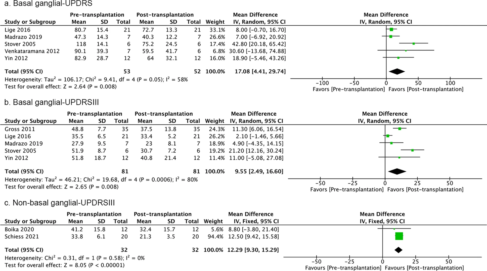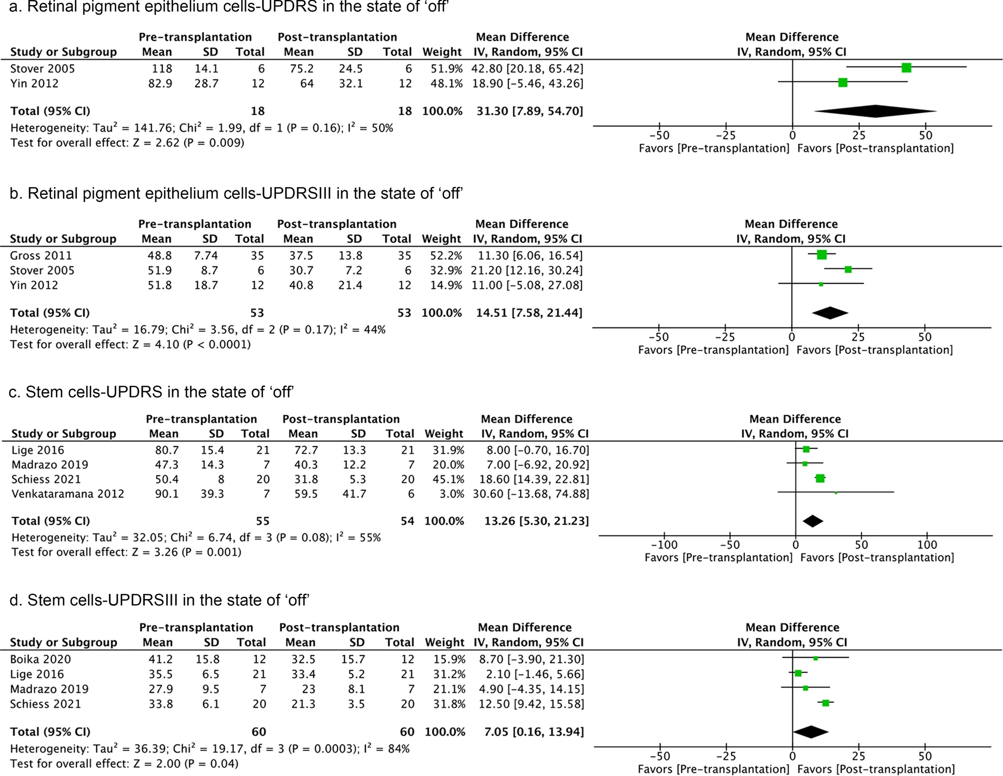 七項(xiàng)研究測量了干細(xì)胞療法對運(yùn)動癥狀的影響。使用隨機(jī)效應(yīng)模型來比較研究最后一次隨訪時(shí)“關(guān)閉”狀態(tài)下治療前與治療后的UPDRSIII評分。細(xì)胞處理后薈萃分析得到了更好的結(jié)果,但異質(zhì)性很高(圖3)。