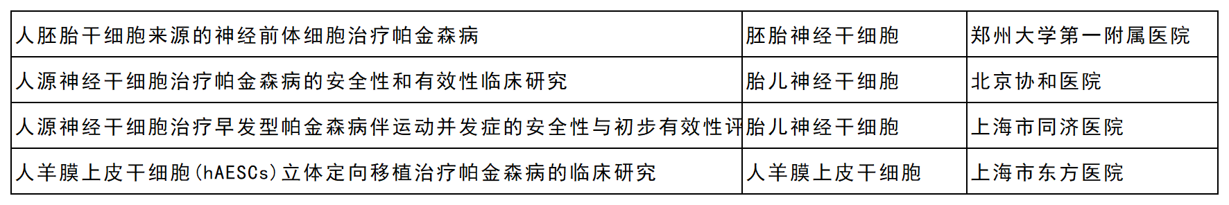 | 胚胎多巴胺細胞 | 種植手術 | 總計34例/(NCT00038116) | 2001年–2009年 |