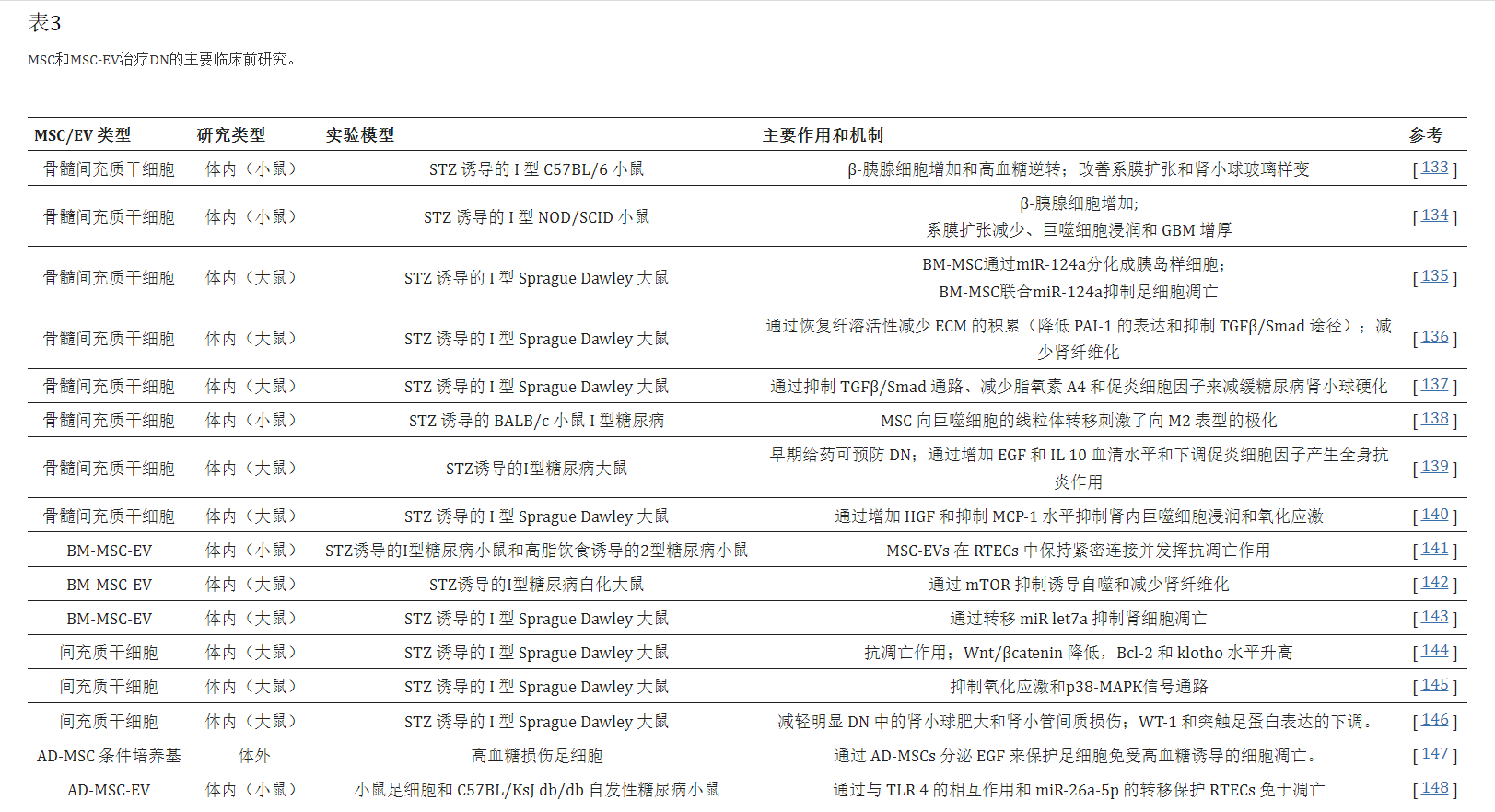 糖尿病腎病是西方國家終末期腎病的主要原因之一。在過去十年中,干細胞療法已被用作糖尿病的治療,總體上取得了可喜的結果,盡管僅在臨床前模型中 (表3)。除了BM-MSC,還有幾項研究使用了其他類型的SC,如EPC、iPSC 和尿源性SC(USC),將在以下小段中單獨分析。