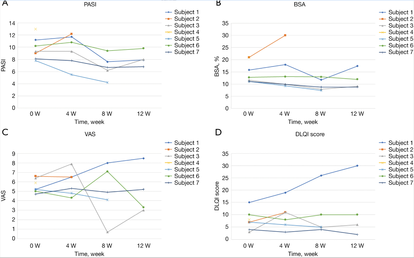 PASI評分從基線到第12周的改善率范圍為-0.36%至46%。圖2顯示了7名參與者的一些結(jié)果測量值。PASI 分數(shù)從基線到第12周逐漸下降(圖2A)。然而,在基線和第12周之間,PASI、BSA、VAS 和DLQI評分沒有統(tǒng)計學(xué)上的顯著差異(參見圖2B-2D)。在試驗過程中,沒有參與者達到PASI-50或PASI-75。