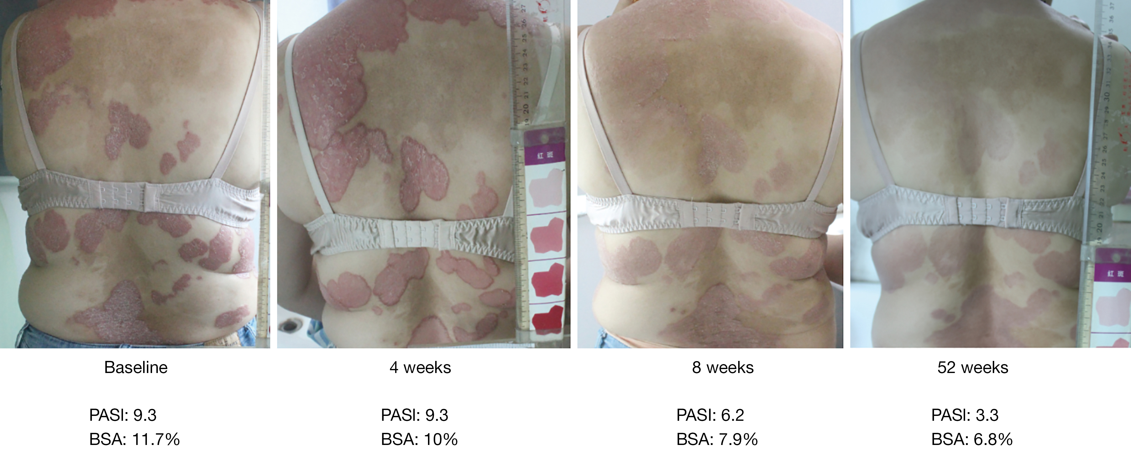 隨訪期間,有2例患者發(fā)現(xiàn)病灶在未接受任何治療的情況下持續(xù)縮小,甚至在治療期后6個月達到PASI-50。其中一名患者在一年的隨訪中保持PASI-50(見圖3)。