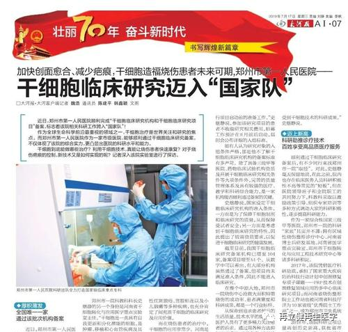 2019年,CCTV央視網(wǎng)曾于《壯麗70年 奮斗新時(shí)代》慶祝建國(guó)70周年的專題欄目中收錄了河南大河報(bào)一篇名為《加快創(chuàng)面愈合、減少疤痕,干細(xì)胞造福燒傷患者未來(lái)可期,鄭州市第一人民醫(yī)院——干細(xì)胞臨床研究邁入“國(guó)家隊(duì)” 》的報(bào)道。