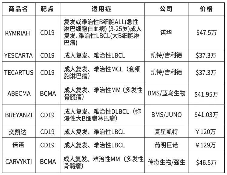 國內已批準復星凱特、藥明巨諾2款靶向于CD19的CAR-T療法、而信達生物/馴鹿醫(yī)療的BCMACAR-T療法正在申請上市,此外美國已批準傳奇生物開發(fā)的BCMACAR-T。