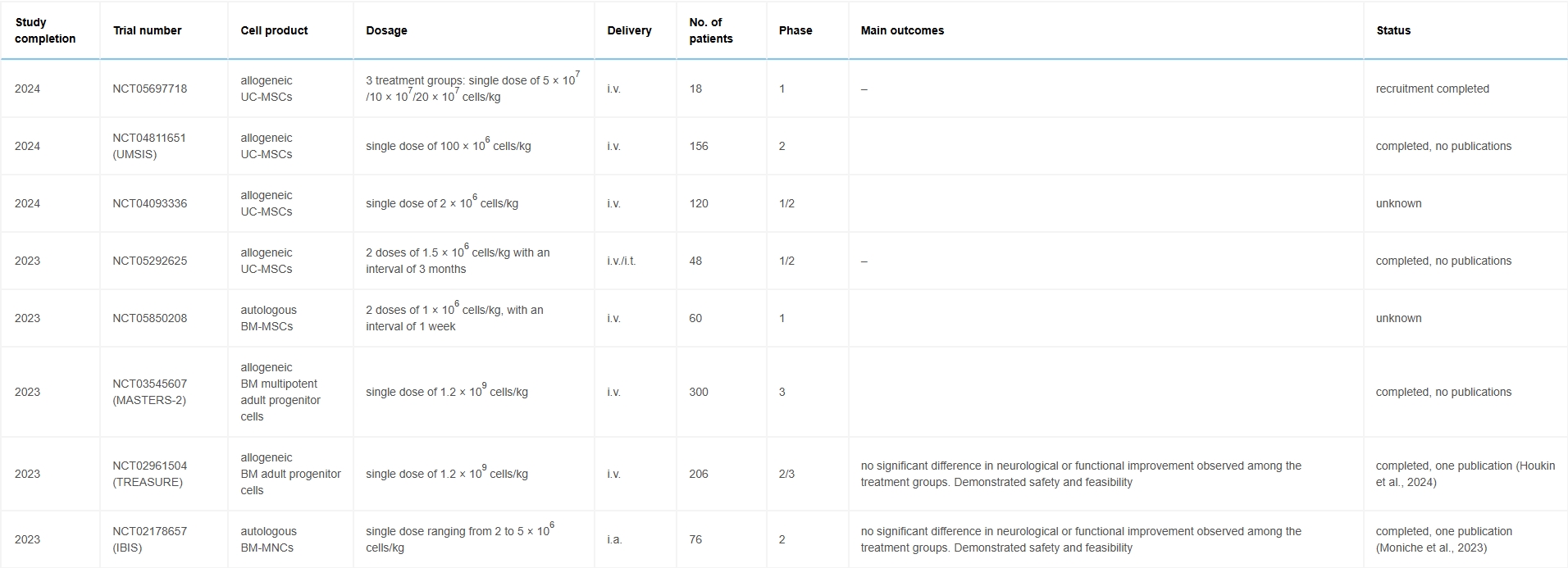 2024年期間,評(píng)估自體間充質(zhì)基質(zhì)細(xì)胞腦內(nèi)移植安全性與耐受性的Ⅰ/Ⅱ期開放標(biāo)簽研究RAINBOW。盡管這些研究顯示出良好的安全性,但療效信號(hào)仍不一致。