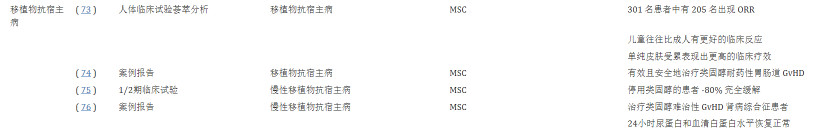 間充質(zhì)干細胞治療移植物抗宿主病:一項關(guān)注MSC治療類固醇難治性aGvHD療效的薈萃分析報告稱,301名患者中有205名表現(xiàn)出總體緩解率 (ORR)。作者表示,與胃腸道和肝臟受累的患者相比,單純皮膚受累的患者表現(xiàn)出更高的臨床療效。此外,兒童往往比成人有更好的臨床反應(yīng)。