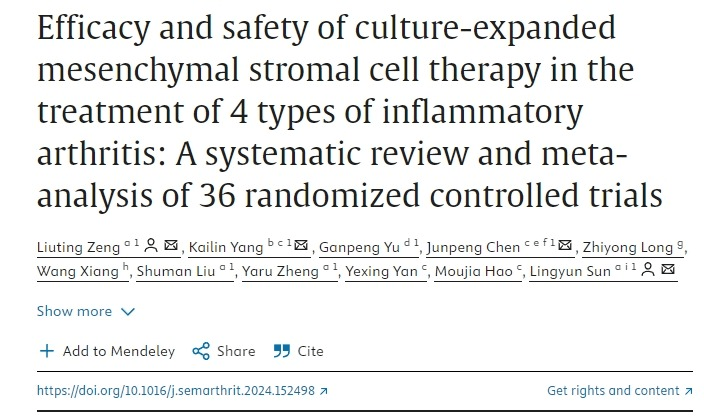 [3]Zeng L, Yang K, Yu G, Chen J, Long Z, Xiang W, Liu S, Zheng Y, Yan Y, Hao M, Sun L. Efficacy and safety of culture-expanded mesenchymal stromal cell therapy in the treatment of 4 types of inflammatory arthritis: A systematic review and meta-analysis of 36 randomized controlled trials. Semin Arthritis Rheum. 2024 Oct;68:152498. doi: 10.1016/j.semarthrit.2024.152498. Epub 2024 Jun 29. PMID: 38970896.