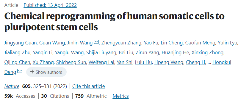 2022年4月13日,北京大學鄧宏魁研究團隊在國際學術期刊Nature上發表的一項題為“Chemical reprogramming of human somatic cells to pluripotent stem cells”的研究論文被央視新聞客戶端、新華社等各大主流媒體刷屏報道,該項研究首次在國際上報道了利用化學小分子誘導技術完整逆轉人成體細胞“發育時鐘”這一革命性的技術研究成果。