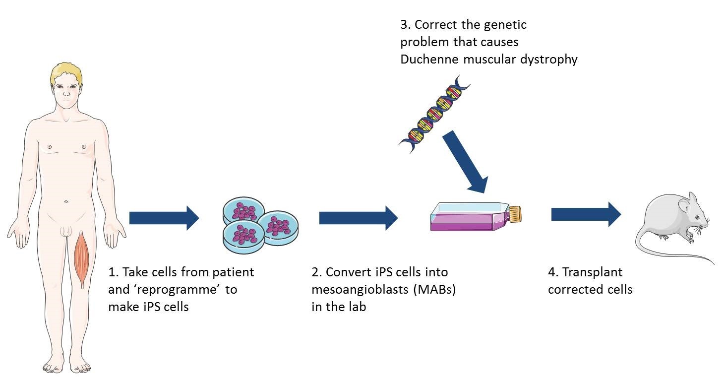 干細胞治療肌營養不良癥的可能途徑:?中成血管細胞 (MAB) 樣細胞可由 iPS 細胞制成。在最近的一項研究中,將 MAB 樣細胞移植到小鼠體內,取得了一些積極的結果。需要更多的研究來確定該策略是否可以為患者帶來治療。