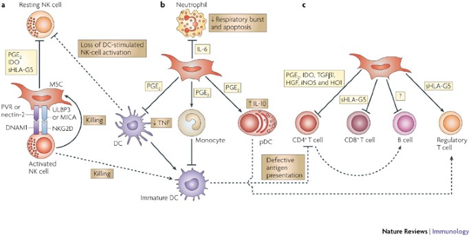 間充質(zhì)干細胞旁分泌因子在免疫調(diào)節(jié)、組織再生和愈合、抗纖維化、抗凋亡和血管生成 中發(fā)揮重要作用。因此成為治療炎癥性疾病的有效方法,例如多發(fā)性硬化癥 、克羅恩病、移植物抗宿主病、系統(tǒng)性紅斑狼瘡和1型糖尿病 。免疫調(diào)節(jié)依賴于間充質(zhì)干細胞與靶組織免疫微環(huán)境之間的相互作用。