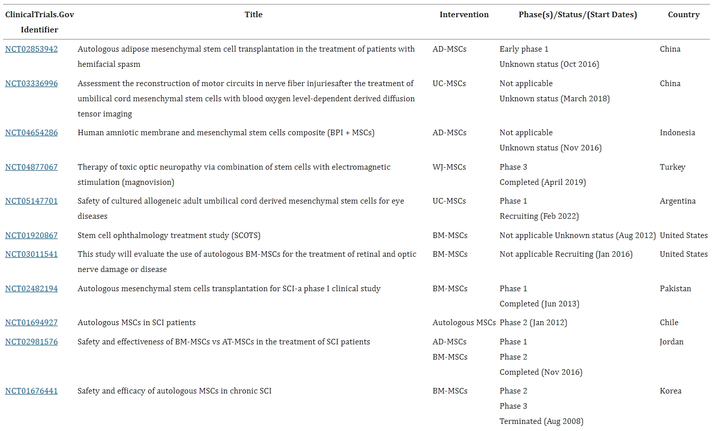 截至今天(2024年12月23日),公共臨床試驗數據庫 ( ClinicalTrials.gov ) 中已注冊7項使用間充質干細胞治療神經損傷的試驗和32項使用間充質干細胞治療脊髓損傷的試驗(表2)。