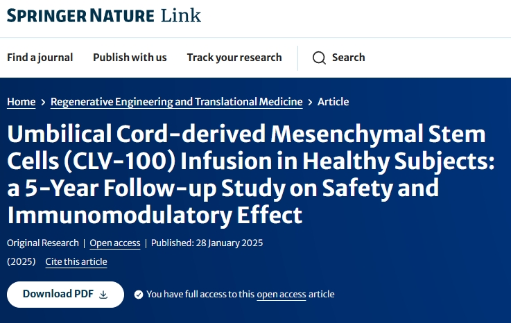 近日,國際醫(yī)學(xué)期刊雜志《Regenerative Engineering and Translational Medicine》發(fā)表了一篇“臍帶間充質(zhì)干細(xì)胞(CLV-100)輸注于健康受試者:安全性和免疫調(diào)節(jié)效果的5年隨訪研究”的臨床試驗(yàn)文章[1]。