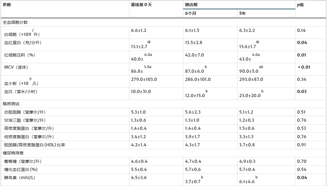 所有受試者5年隨訪時(shí)的實(shí)驗(yàn)室檢查結(jié)果均在正常參考范圍內(nèi)(表3)。與基線測量值相比,血紅蛋白、紅細(xì)胞壓積 (HCT) 和平均紅細(xì)胞體積 (MCV) 均顯著增加。5年隨訪時(shí)的紅細(xì)胞沉降率 (ESR) 也顯著高于6個月隨訪時(shí)的水平。由于ESR通常隨年齡增長而升高,因此這種升高是可以預(yù)料的,而本組受試者(中位年齡56.0歲)的ESR值保持在正常范圍內(nèi)(< 30 mm/h)。