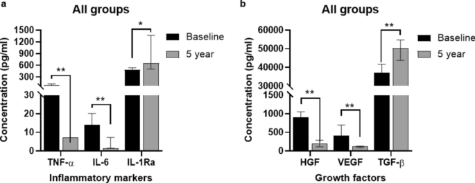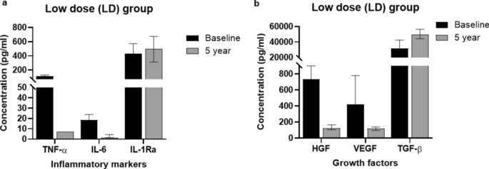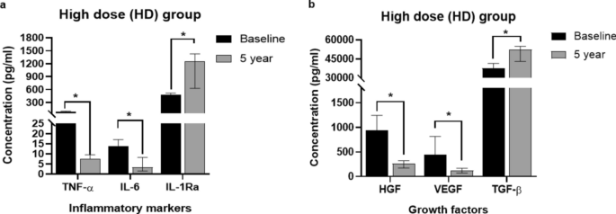 HD組在5年隨訪中維持了更強(qiáng)的抗炎表型:IL-1Ra水平較基線持續(xù)升高,且顯著高于LD組。同時(shí),HD組的HGF水平和TGF-β升高趨勢更明顯,表明高劑量輸注可能通過持續(xù)調(diào)控HGF/TGF-β通路增強(qiáng)組織修復(fù)潛力(圖3b、5)。
