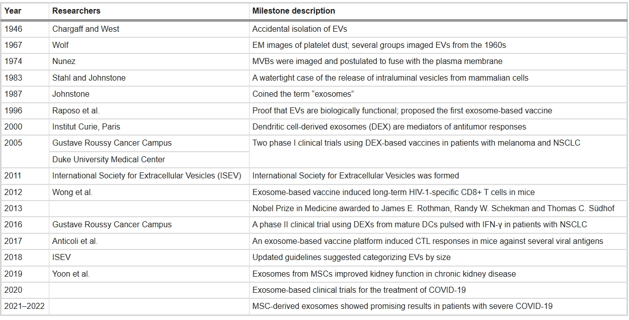 細胞外囊泡(EVs)是脂質雙分子層包裹的納米顆粒,攜帶跨膜蛋白、RNA及代謝物,介導細胞間通訊。自1946年首次在血液中被發現,EVs歷經數十年研究:1960年代稱”血小板塵埃”;1980年代在直腸腺瘤細胞中被觀測;1987年”外泌體”術語正式確立。77年來,學界確認幾乎所有細胞均分泌EVs,其廣泛存在于生物體液中,成為疾病診療的新靶點(表1)。