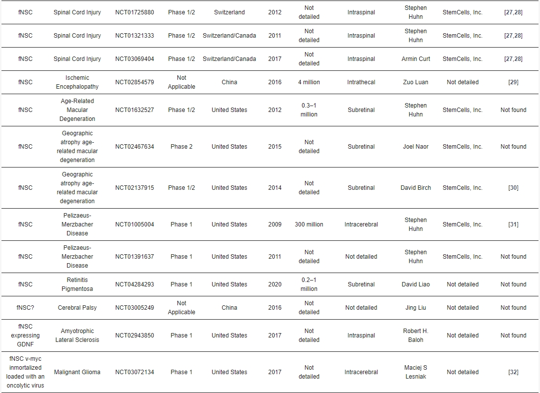 到目前為止,大多數(shù)臨床試驗(yàn)都使用胎兒NSC(fNSC),但來自其他來源(例如多能干細(xì)胞(PSC)的 NSC也越來越多地進(jìn)入臨床階段。此外,原發(fā)性NSC的新來源,例如脊柱裂的腦脊液 (CSF) 或腦室內(nèi)出血 (ICVH) 早產(chǎn)兒的腦脊液 (CSF) 已被報(bào)道,并且可能在不久的將來可用(圖1)。