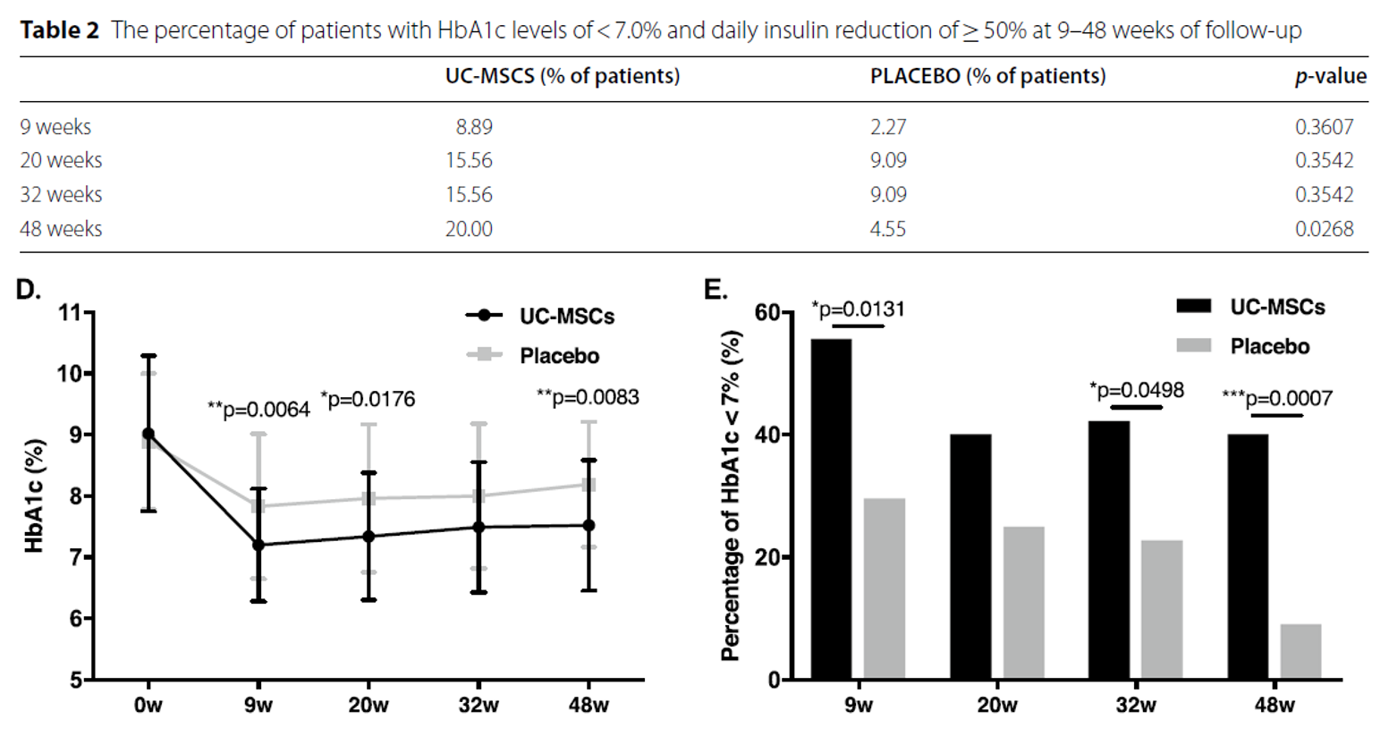 經(jīng)過48周的治療周期后,研究團隊發(fā)現(xiàn),接受間充質(zhì)干細胞(UC-MSCs)治療的2型糖尿病患者中,有20%的患者的糖化血紅蛋白(HbA1c)水平成功降至7.0%以下,并且他們的日均胰島素用量減少了超過一半。相比之下,僅接受安慰劑治療的患者中,僅有4.55%達到了這一血糖控制目標(biāo)。兩組之間的這一差異在統(tǒng)計學(xué)上被認為是顯著的。