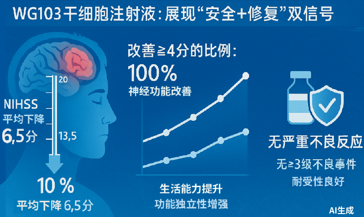 WG103是一種源自新生兒臍帶組織的間充質(zhì)干細(xì)胞一類新藥。該藥物不直接替代受損腦細(xì)胞,而是通過調(diào)節(jié)炎癥反應(yīng)、重塑腦內(nèi)微環(huán)境、促進(jìn)神經(jīng)與血管再生、修復(fù)血腦屏障及神經(jīng)網(wǎng)絡(luò)等多重機(jī)制,助力大腦啟動(dòng)自身修復(fù)程序。在今年7月中國卒中學(xué)會(huì)年會(huì)上,WG103的Ⅰ期臨床數(shù)據(jù)首次發(fā)布,其良好安全性及初步有效性結(jié)果為Ⅱ期多中心研究的推進(jìn)提供了有力支持。