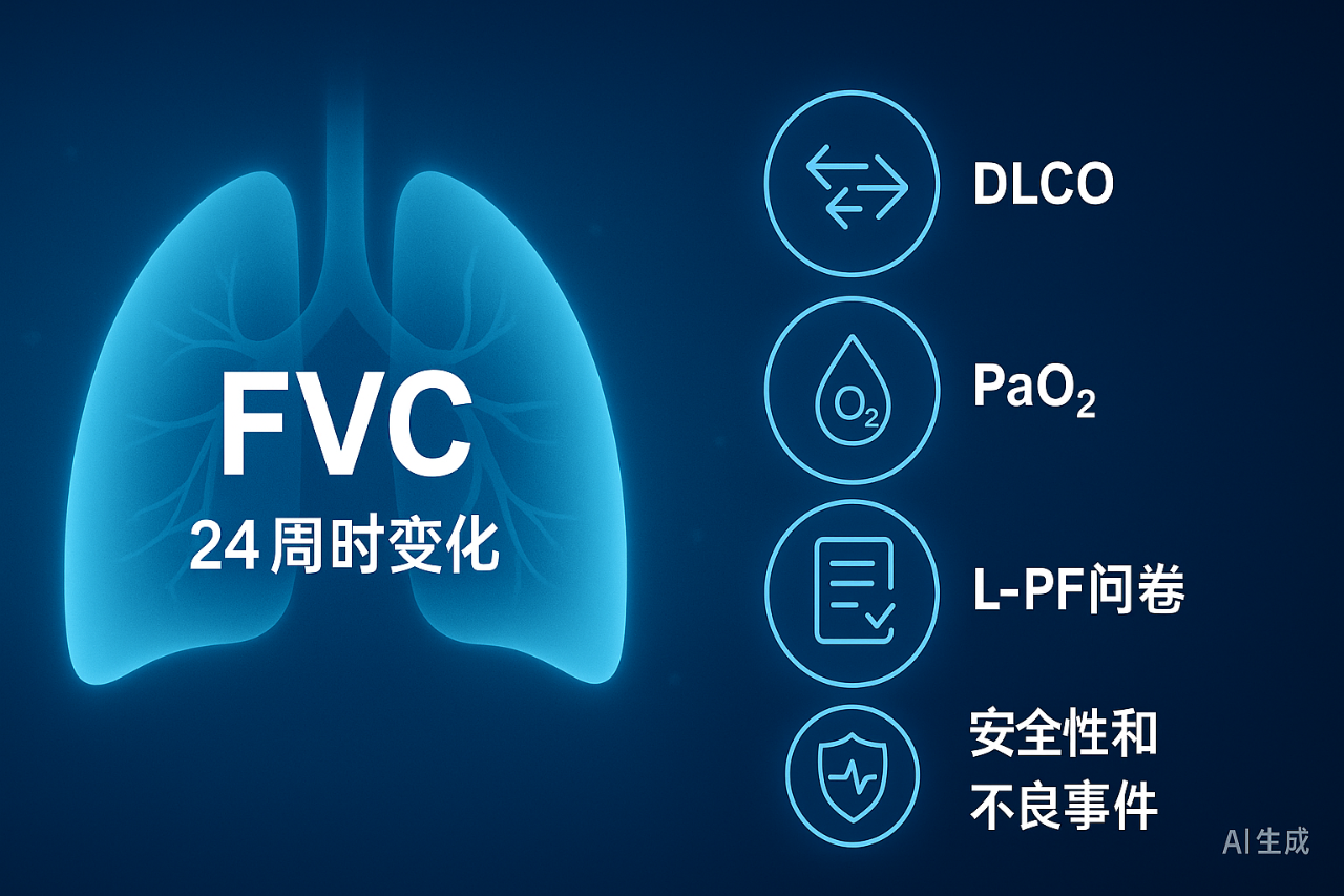 主要觀察指標為24周時FVC(肺活量)的變化,該指標是評估肺容量和纖維化進展的關鍵依據。次要終點包括肺彌散功能(DLCO)、動脈血氧分壓(PaO?)、生活質量問卷(L-PF Symptoms/Impacts)評分、6分鐘步行距離以及輸注相關反應和不良事件。