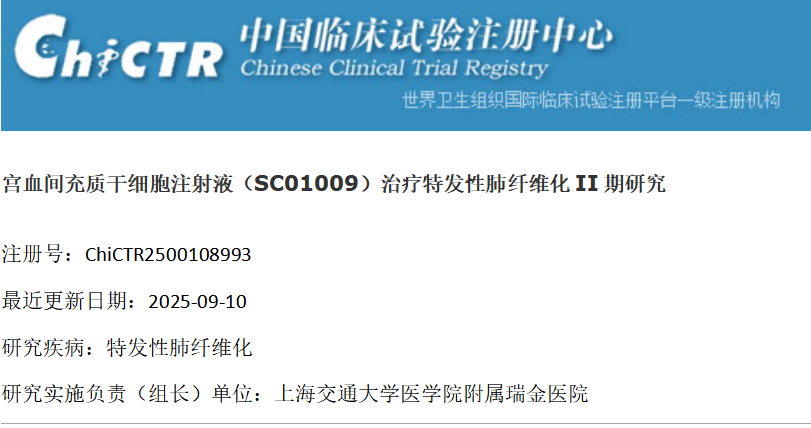 今年9月10日,中國臨床試驗注冊中心公布了一項具有重要意義的新動態:由上海交通大學醫學院附屬瑞金醫院主導的“宮血間充質干細胞注射液(SC01009)”Ⅱ期臨床研究已正式啟動。