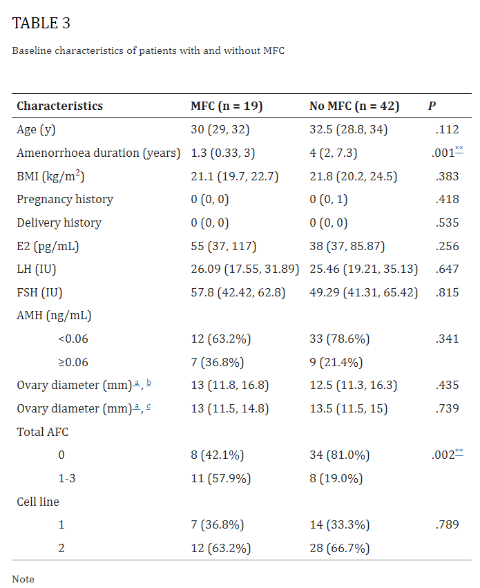 表3:有和沒有MFC患者的基線特征,縮寫:AFC,竇卵泡計數;AMH,抗苗勒管激素;BMI,體重指數。a平均直徑。b左側卵巢。c右側卵巢。