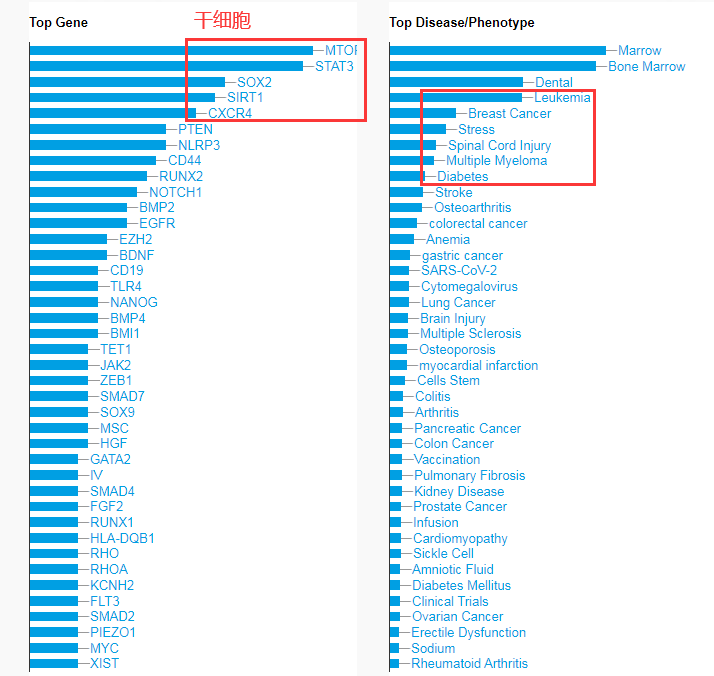 如下圖所示, 白血病、乳腺癌、脊髓損傷、多發性骨髓瘤、糖尿病等是干細胞研究中最關注的疾病。其他疾病還包括中風、骨關節炎、大腸癌、貧血、胃癌、SARS-CoV-2、肺癌、腦損傷、多發性硬化癥、骨質疏松癥等。