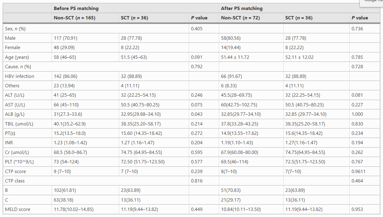 最初共納入248名DLC患者,排除47名患者。最終共納入201名受試者,其中接受HUCB-MSCT的患者36名,未接受移植的患者165名。?除白蛋白(ALB)水平外, PSM前非SCT組與SCT組之間無顯著差異(均P>0.05)。通過將病例與非SCT的比率限制為1比2來解決偏倚,這導致SCT組中的36名患者和非SCT組中的72名患者具有可比較的基線特征(表1)。
