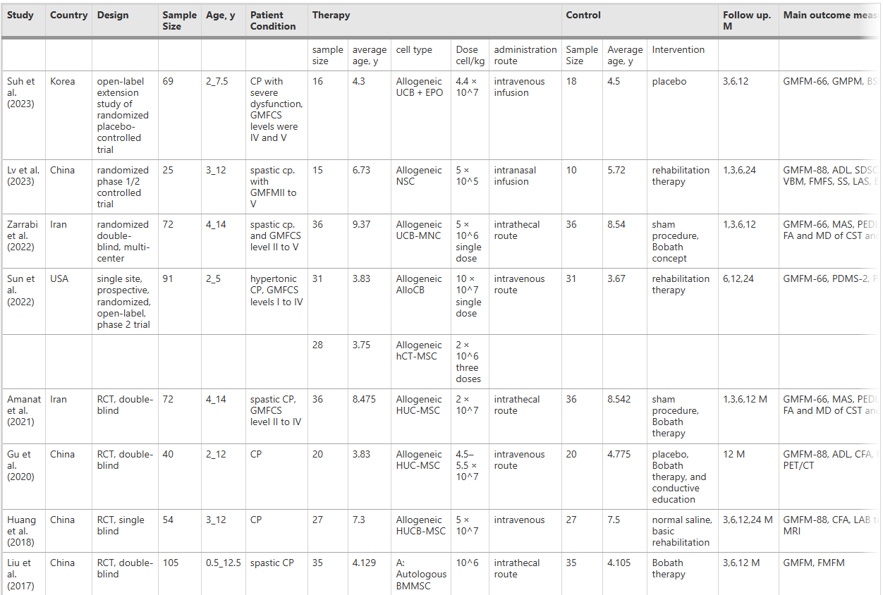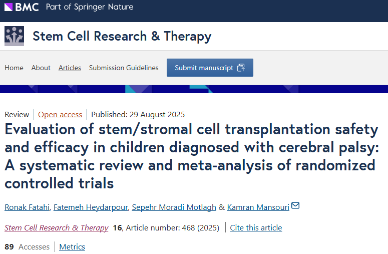 參考資料:[1]:Fatahi R, Heydarpour F, Motlagh SM, Mansouri K. Evaluation of stem/stromal cell transplantation safety and efficacy in children diagnosed with cerebral palsy: A systematic review and meta-analysis of randomized controlled trials. Stem Cell Res Ther. 2025 Aug 29;16(1):468. doi: 10.1186/s13287-025-04550-9. PMID: 40877893; PMCID: PMC12395659.