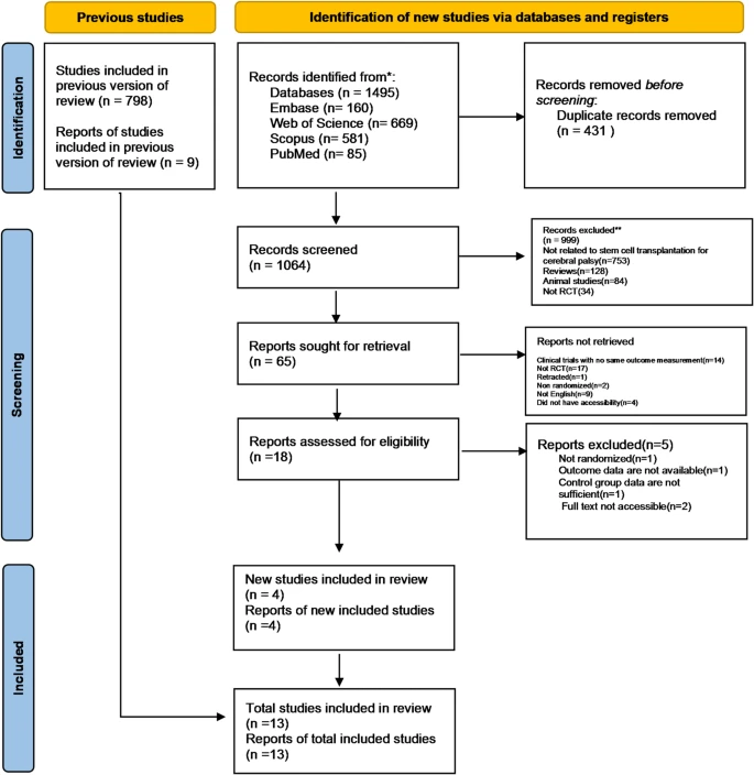 近期,國際知名干細胞雜志《Stem Cell Res Ther》發表了一項題為“評估干細胞/間質細胞移植對確診為腦癱兒童的安全性和有效性:隨機對照試驗的系統回顧和薈萃分析”的研究。該研究旨在系統評估干細胞或基質細胞療法對腦癱兒童的療效和安全性[1]