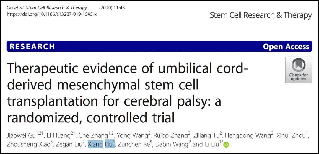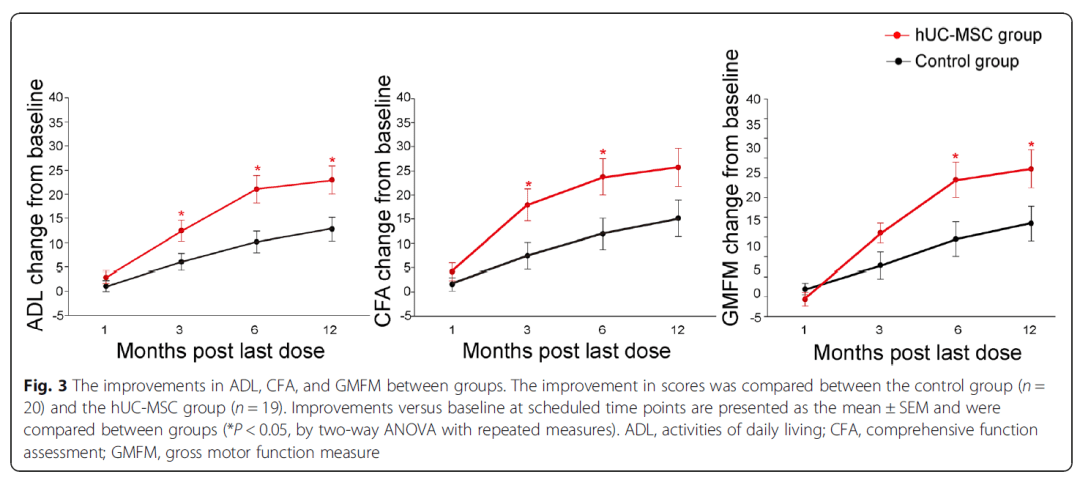 40例符合條件的患者隨機(jī)分為hUC-MSC(人臍帶間充質(zhì)干細(xì)胞)治療組和對照組。除康復(fù)治療,hUC-MSC組接受4次靜脈輸注hUC-MSCs,對照組則接受安慰劑。通過12個月的隨訪進(jìn)行安全性評估(通過不良事件(AEs) )和有效性評估(通過日常生活活動能力(ADL)量表、綜合健康功能評估(CFA)和粗大運(yùn)動功能評估量表(GMFM)?)。