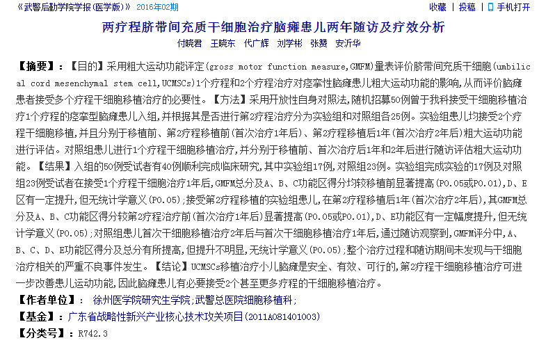 2016年,徐州醫(yī)學(xué)院研究生學(xué)院研究人員發(fā)表論文,旨在采用粗大運(yùn)動功能評定量表評價(jià)臍帶間充質(zhì)干細(xì)胞1個療程和2個療程治療對痙攣性腦癱患兒粗大運(yùn)動功能的影響,從而評價(jià)腦癱患者接受多個療程干細(xì)胞移植治療的必要性。研究指出,臍帶間充質(zhì)干細(xì)胞移植治療小兒腦癱是安全、有效、可行的,第2療程干細(xì)胞移植治療可進(jìn)一步改善患兒運(yùn)動功能,因此腦癱患兒有必要接受2個甚至更多療程的干細(xì)胞移植治療。該文發(fā)表在2016年第02期《武警后勤學(xué)院學(xué)報(bào)(醫(yī)學(xué)版)》雜志上。