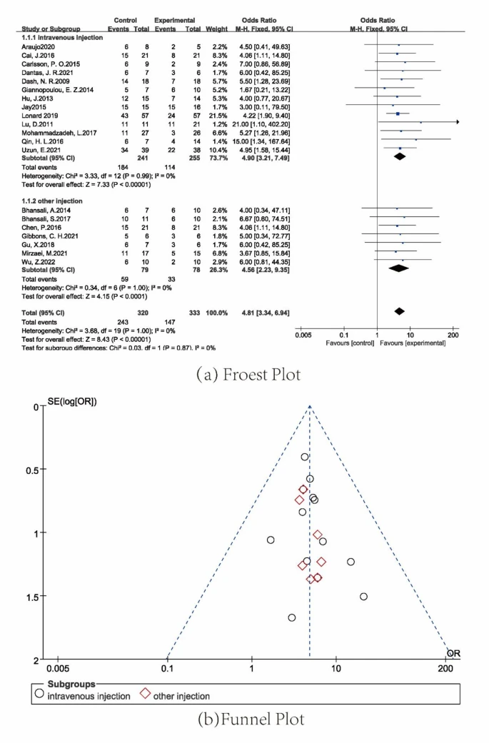 本研究通過薈萃分析評估不同MSCs注射方式對糖尿病治療的療效差異。基于20項研究(12項靜脈注射、8項其他注射)的數據進行分析。