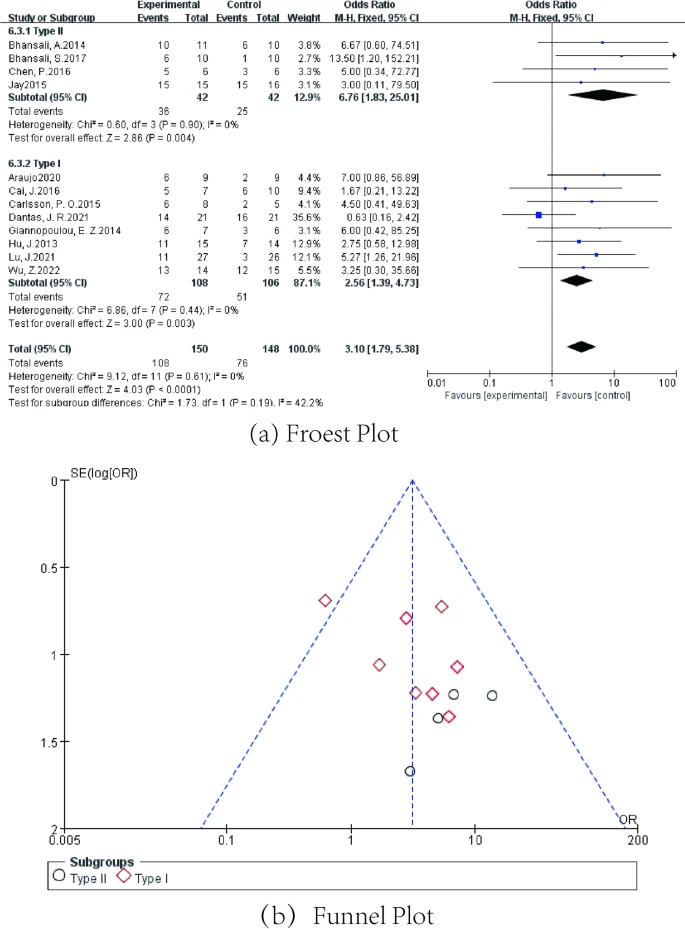 本研究通過薈萃分析評估間充質干細胞治療1型糖尿病與2型糖尿病的療效差異。基于12項研究(8項I型、4項II型)的二分類數據,固定效應模型顯示MSCs對兩類糖尿病均具有顯著療效,且置信區間未跨越無效值。分層分析表明,II型糖尿病的效應值(6.76)顯著高于I型(2.56),表明MSCs在治療II型糖尿病方面更有效。這些數據為糖尿病提供了新的見解,其中MSCs是治療II型糖尿病最有效的方法。