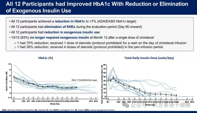 在針對嚴重1型糖尿病伴低血糖無知覺患者的試驗中,83%(10/12)的患者一年內完全停用胰島素,所有患者HbA1c降至正常(<7%)、血糖達標時間(TIR)超93%,且嚴重低血糖事件從第90天起清零,首次實現接近“功能性治愈”的療效。