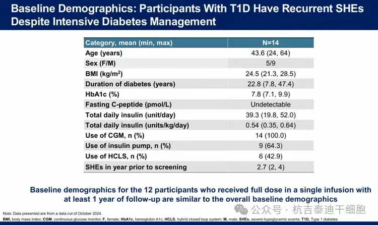此次公布數據的I/II期研究是一項開放標簽、單臂臨床試驗,共納入了14例低血糖感知受損(IHA)且每年至少發生兩次嚴重低血糖(SHE)事件的1型糖尿病成人患者,評估了單次輸注全劑量Zimislecel(0.8*109個細胞)后至少隨訪1年的療效和安全性。