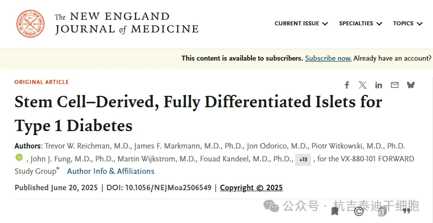 2025年6月20號《新英格蘭醫學雜志》發表了一項《干細胞衍生的完全分化胰島用于1型糖尿病》的研究結果[1]。