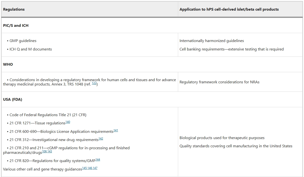 除了特定司法管轄區(qū)的規(guī)定外,藥品檢驗合作計劃 (PIC/S)、人用藥品技術要求國際協(xié)調(diào)會 (ICH) 和世界衛(wèi)生組織 (WHO) 等國際組織還匯編了細胞和基因治療產(chǎn)品的協(xié)調(diào)和指導文件。不同國家監(jiān)管機構 (NRA) 針對細胞治療產(chǎn)品編寫的指南匯編已在其他地方概述。在這里,我們重點介紹了與生成用于臨床應用的hPS細胞衍生的胰島/β細胞相關的關鍵監(jiān)管考慮因素。