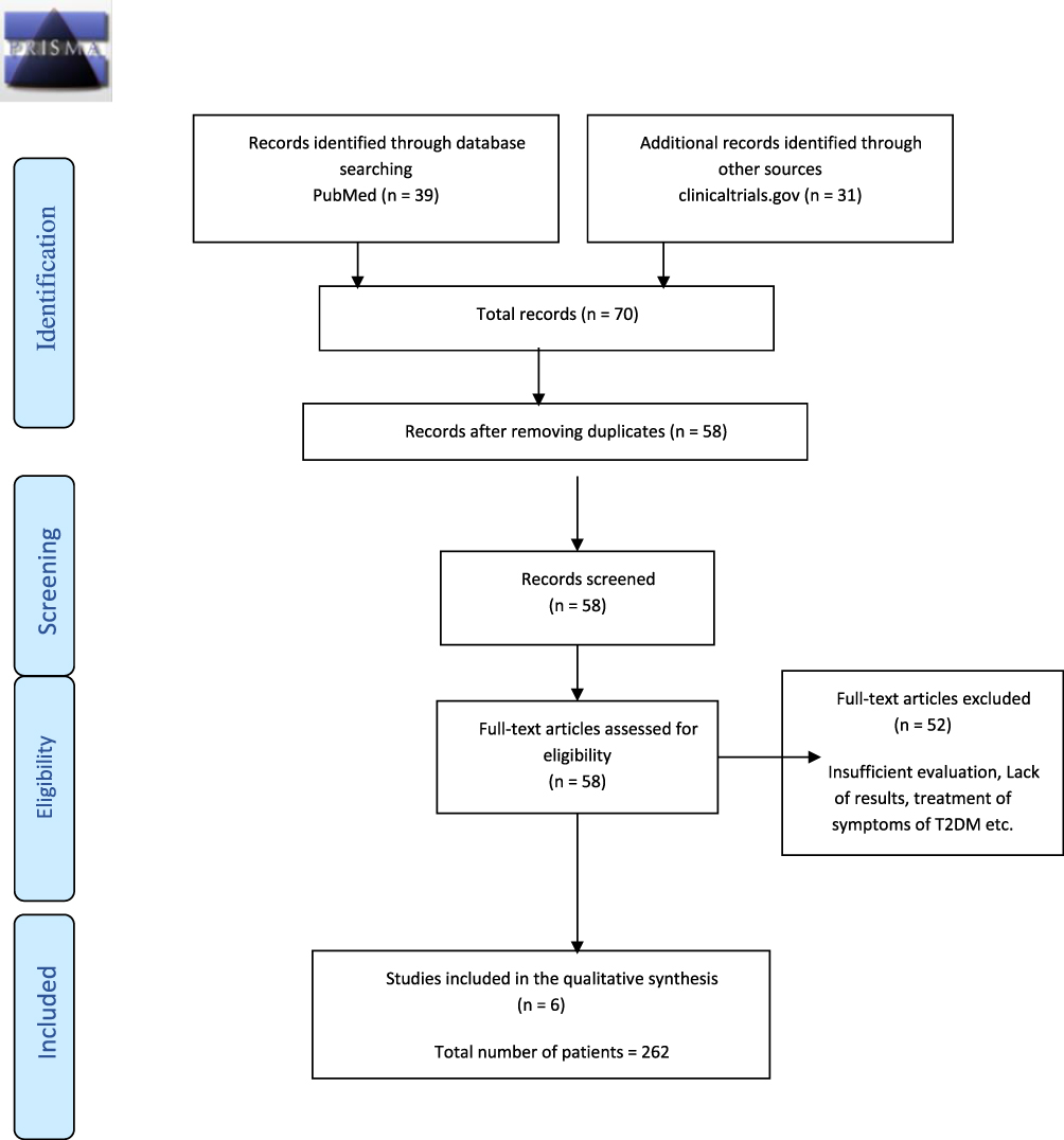 總共收集了70個(gè)試驗(yàn);檢查重復(fù)記錄后只剩下58人。在58項(xiàng)臨床試驗(yàn)中,僅包括六項(xiàng)研究(T1、T2、T3、T4、T5、T6)(表1)。其余的需要更全面的結(jié)果,關(guān)于治療評估方法的信息不足,旨在報(bào)告與T2DM相關(guān)的長期合并癥而不是疾病的治療,非隨機(jī)化,參與者有其他病態(tài)。薈萃分析中包含的研究均使用自體 MSCs注射,無論其來源如何。