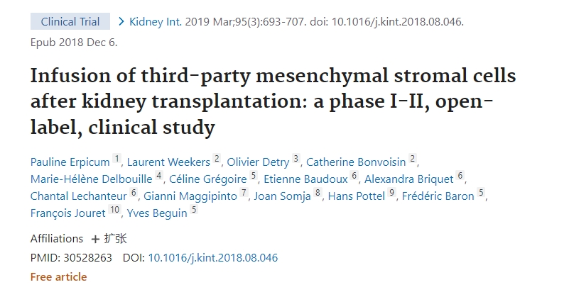 [4]Erpicum P, Weekers L, Detry O, Bonvoisin C, Delbouille MH, Grégoire C, Baudoux E, Briquet A, Lechanteur C, Maggipinto G, Somja J, Pottel H, Baron F, Jouret F, Beguin Y. Infusion of third-party mesenchymal stromal cells after kidney transplantation: a phase I-II, open-label, clinical study. Kidney Int. 2019 Mar;95(3):693-707. doi: 10.1016/j.kint.2018.08.046. Epub 2018 Dec 6. PMID: 30528263.