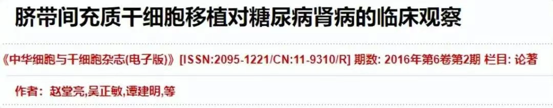2016年《中華細胞與干細胞雜志》報道了第二軍醫大學臨床醫學院進行臍帶間充質干細胞移植干預糖尿病腎病的臨床案例,這場臨床研究共有15名糖尿病腎病患者。[1]