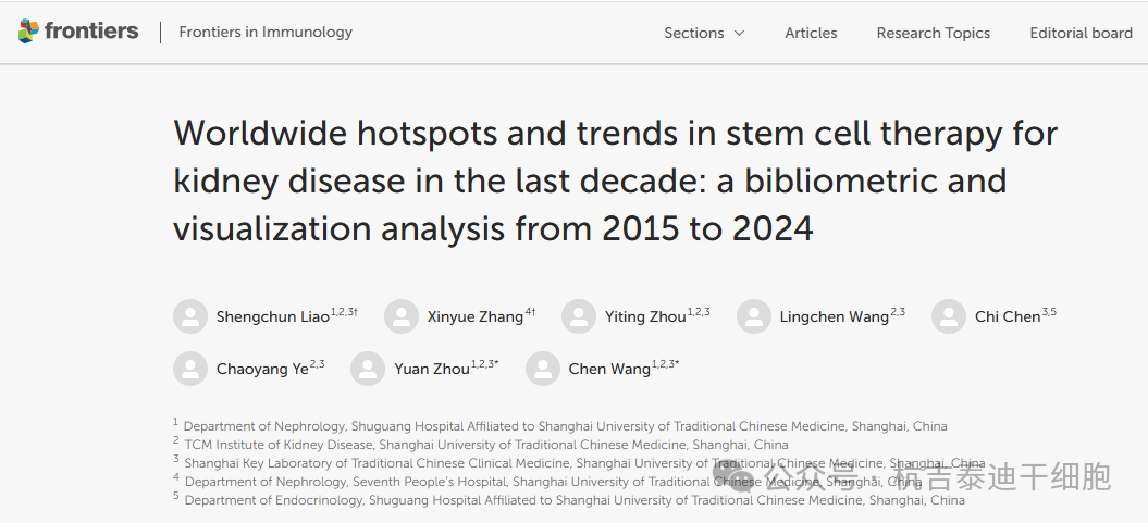 在此背景下,近期,上海中醫藥大學附屬曙光醫院腎內科聯合上海中醫藥大學中醫腎病研究所等機構團隊,在國際權威期刊《Frontiers in Immunology》上發表了題為“近十年全球腎臟疾病干細胞治療熱點與趨勢:2015年至2024年的文獻計量與可視化分析”的研究綜述。