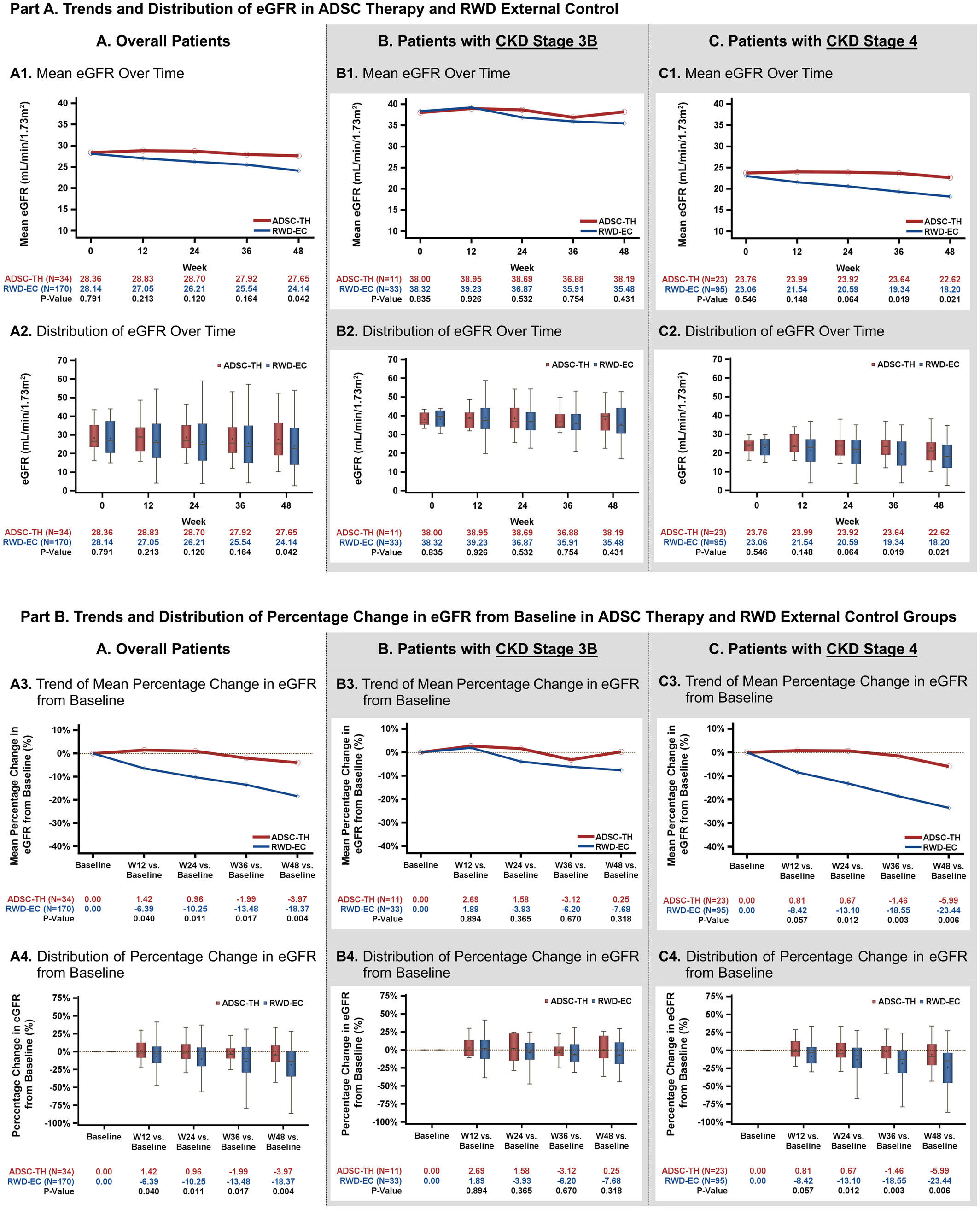 在CKD3期,兩組的eGFR百分比變化無顯著差異,表明總體穩(wěn)定性良好。然而,在CKD4期,RWD EC組與ADSC治療組相比出現(xiàn)了統(tǒng)計(jì)學(xué)上的顯著下降,這表明在晚期CKD患者中,ADSC治療組的短期腎功能軌跡更加穩(wěn)定。
