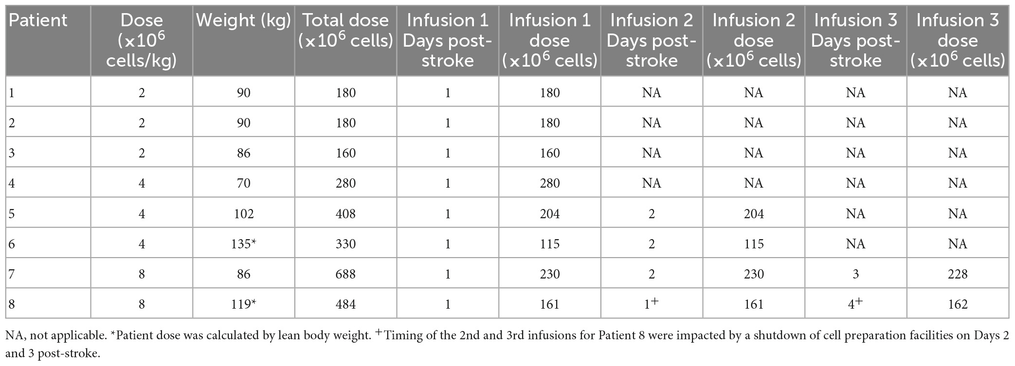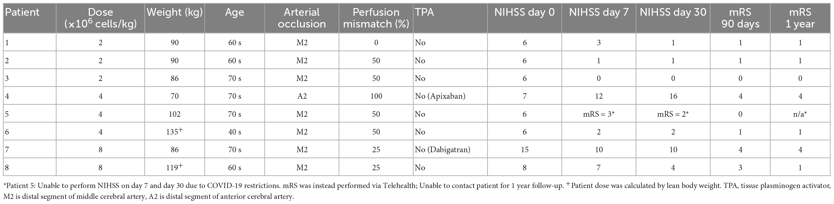 結果:8名患者(6名男性)在缺血性中風發(fā)作24小時內被招募,并接受hAEC輸注。我們能夠將hAEC的劑量增加至8×10^6個細胞/kg(2×10^6/kg,n=3;4×10^6/kg,n=3;8×10^6/kg,n=2)。平均年齡為68.0±10.9(平均值±標準差)。高血壓、高脂血癥的發(fā)生率為87.5%,糖尿病為37.5%,房顫為50%,缺血性心臟病為37.5%,曾經(jīng)吸煙者為25%。