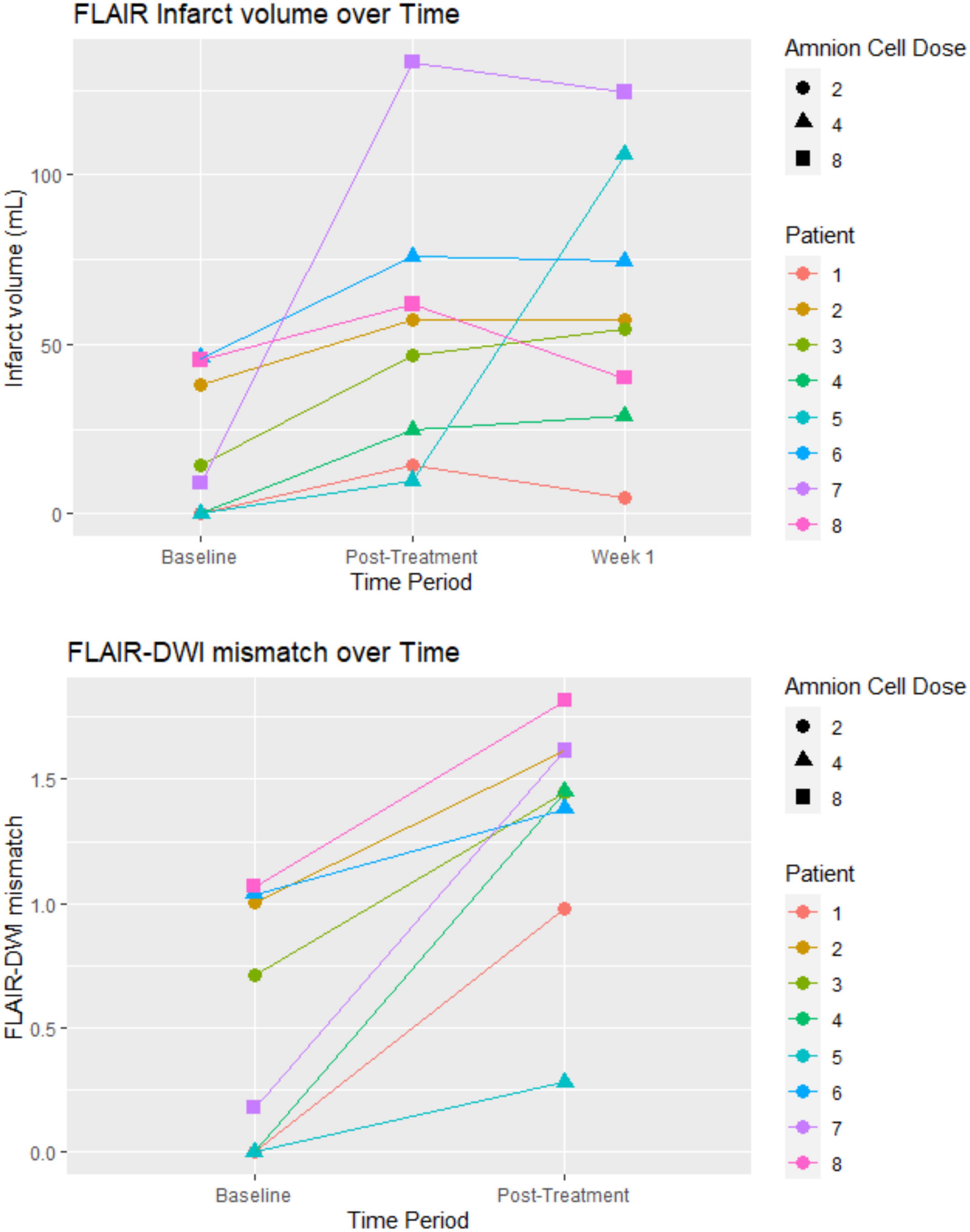 圖1說明第一周梗塞體積的變化。細胞輸注完成后,八名患者中有七名的梗塞體積沒有明顯增加。患者4在接受hAEC后的第二天再次出現(xiàn)中風,患者7在完成hAEC輸注之前出現(xiàn)明顯的梗塞生長,但NIHSS沒有出現(xiàn)臨床惡化。NIHSS從入院時的15降至7天時的10(表1)。基線時FLAIR成像的中位梗塞體積為11.74ml(IQR0, 39.89)。基線DWI中位缺血體積為29.10ml(IQR6.99,42.92)。治療后的中位梗塞體積為52.05ml(UQR22.2,65.4)。1周時的中位梗塞體積為55.77ml(IQR37.26,82.28)。