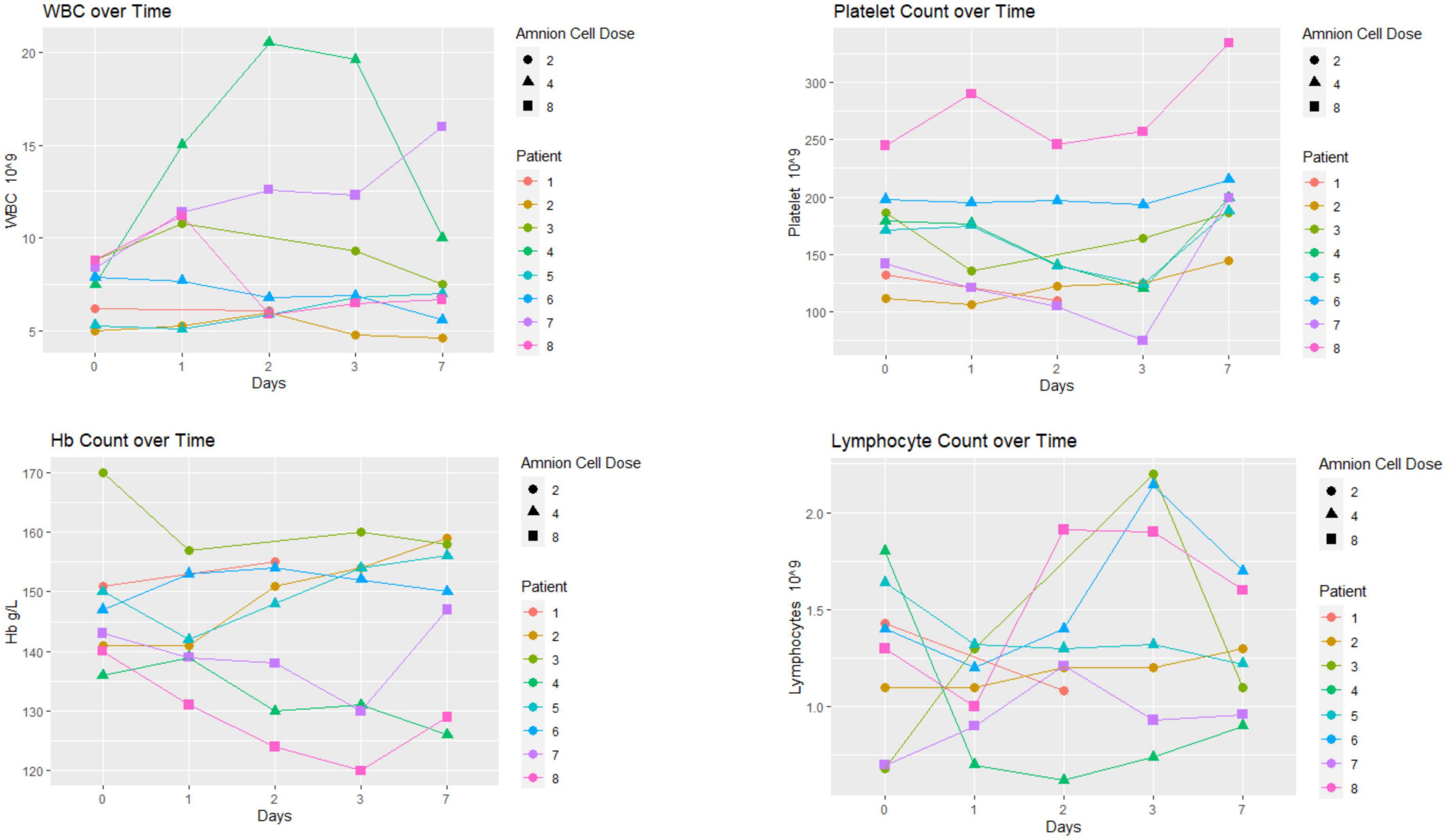 免疫學變化如圖3、4所示。在這8名患者中沒有觀察到特殊的模式。簡而言之,結果沒有顯示出明顯的趨勢,特別是在hAEC的效果方面(例如,接受最高劑量的患者7和8與接受最低劑量的患者1-3之間)。我們無法檢測(或檢測到低水平)幾種炎癥標志物(IFN-γ、IL-6、TNF、IL-10和IL-17)。高敏CRP和MMP-9水平保持在正常范圍內。在三名患者(患者1-3)中,MMP-9水平在第一周內沒有變化。