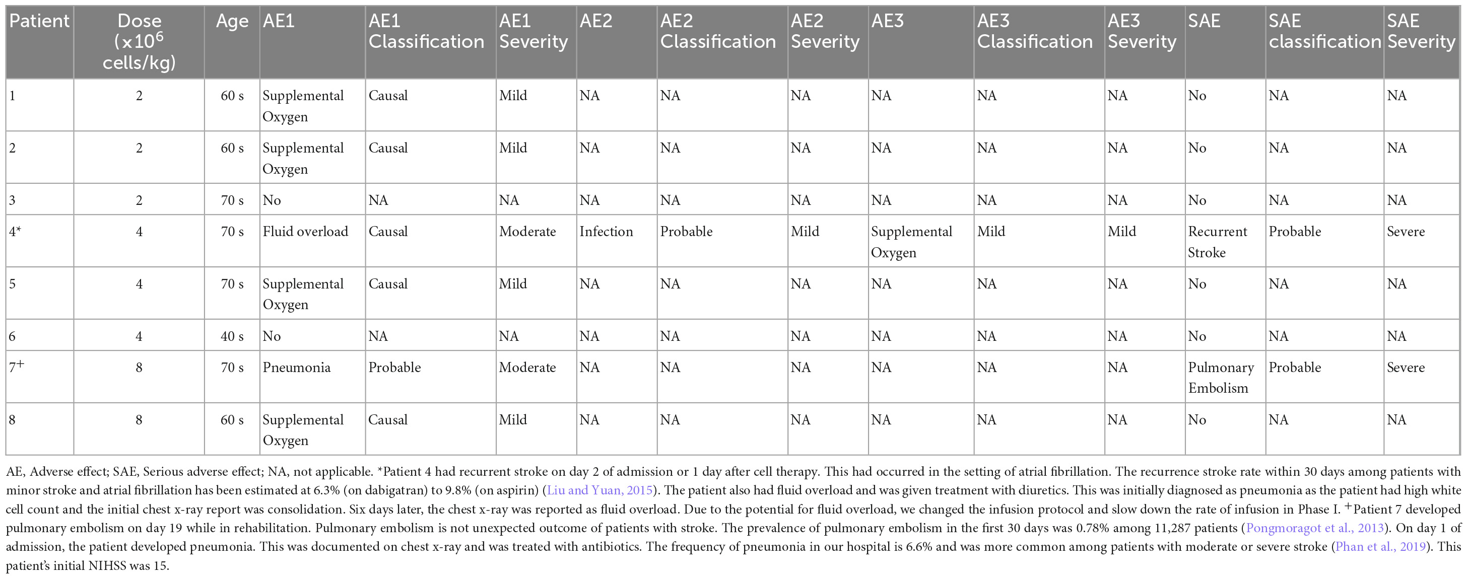 總體而言,基線NIHSS為7.5±3.1,24小時時為7.8±7.2,1周時為4.9±5.4(n=8)。90天時的改良Rankin量表為2.1±1.2。在hAEC輸注期間,五名患者接受了補充氧氣。使用預先定義的標準,發(fā)生了兩起嚴重的不良事件。一名患者在康復期間出現(xiàn)復發(fā)性中風,另一名患者出現(xiàn)肺栓塞。對于最后四名患者,hAEC的輸注在隨后的幾天中分次進行,以降低液體超負荷的風險。